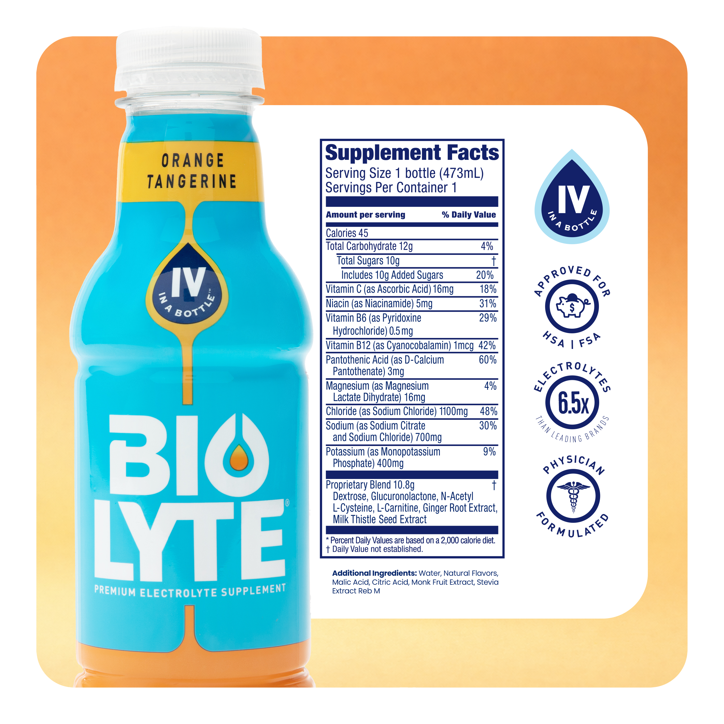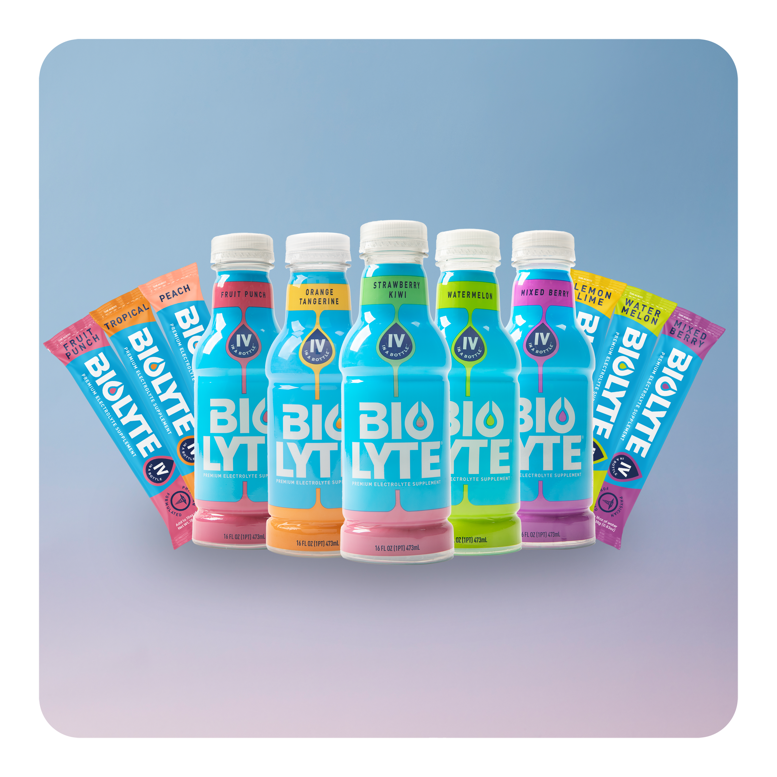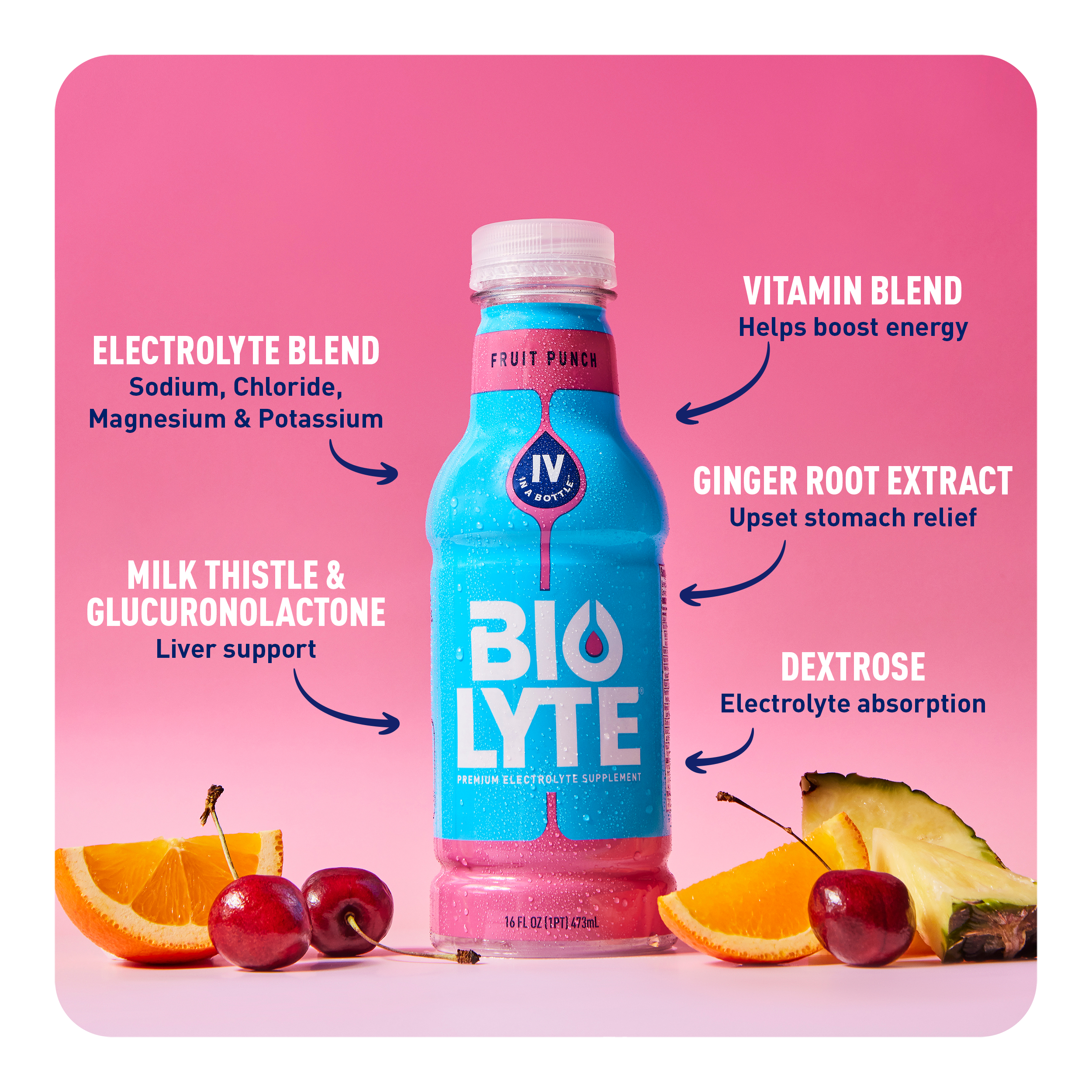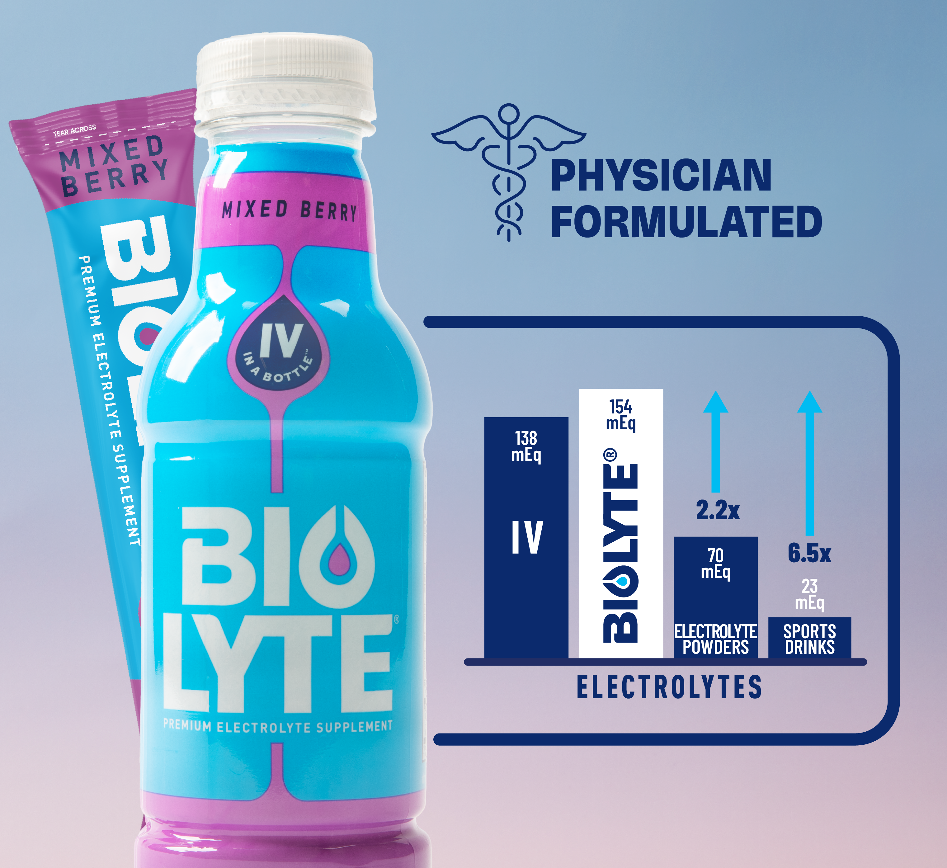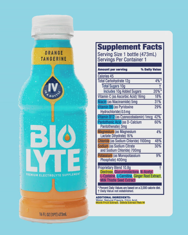 BIOLYTE® is made up of a precise balance of sodium, chloride, and potassium. Designed to match the IV. By mirroring the balance your body actually uses.